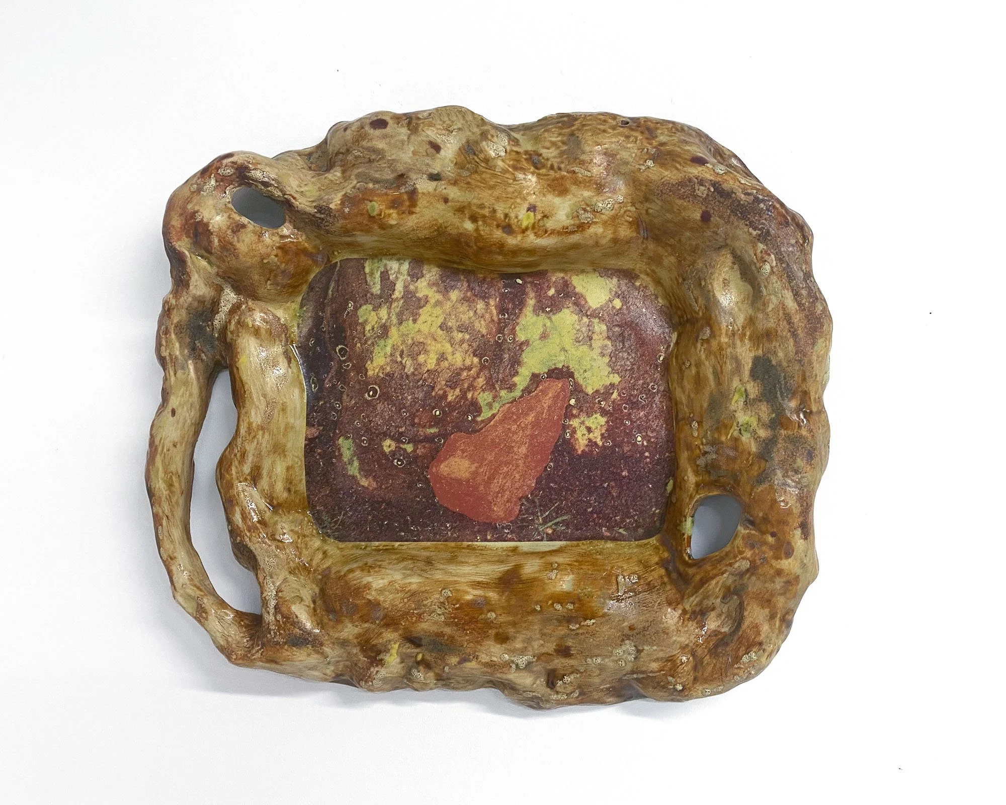 Embodied Infrastructure V, 2025, 17"×18"×2.5", Glazed ceramic with glaze decal created from risograph print